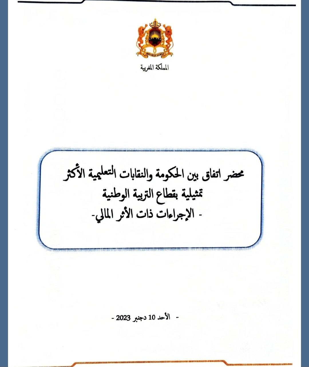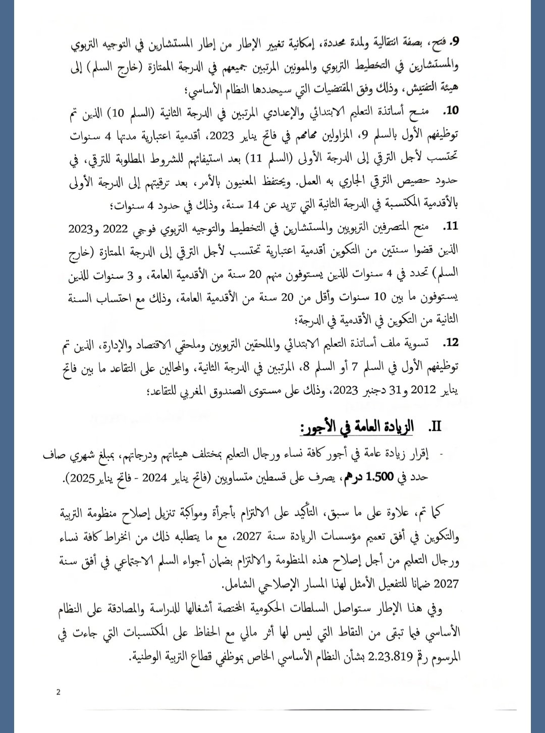 وفي هذا الإطار ستواصل السلطات الحكومية المختصة أشغالها للدراسة والمصادقة على النظام الأساسي فيما تبقى من النقاط التي ليس لها أثر مالي مع الحفاظ على المكتسبات التي جاءت في المرسوم رقم 2.23.819 بشأن النظام الأساسي الخاص بموظفي قطاع التربية الوطنية.