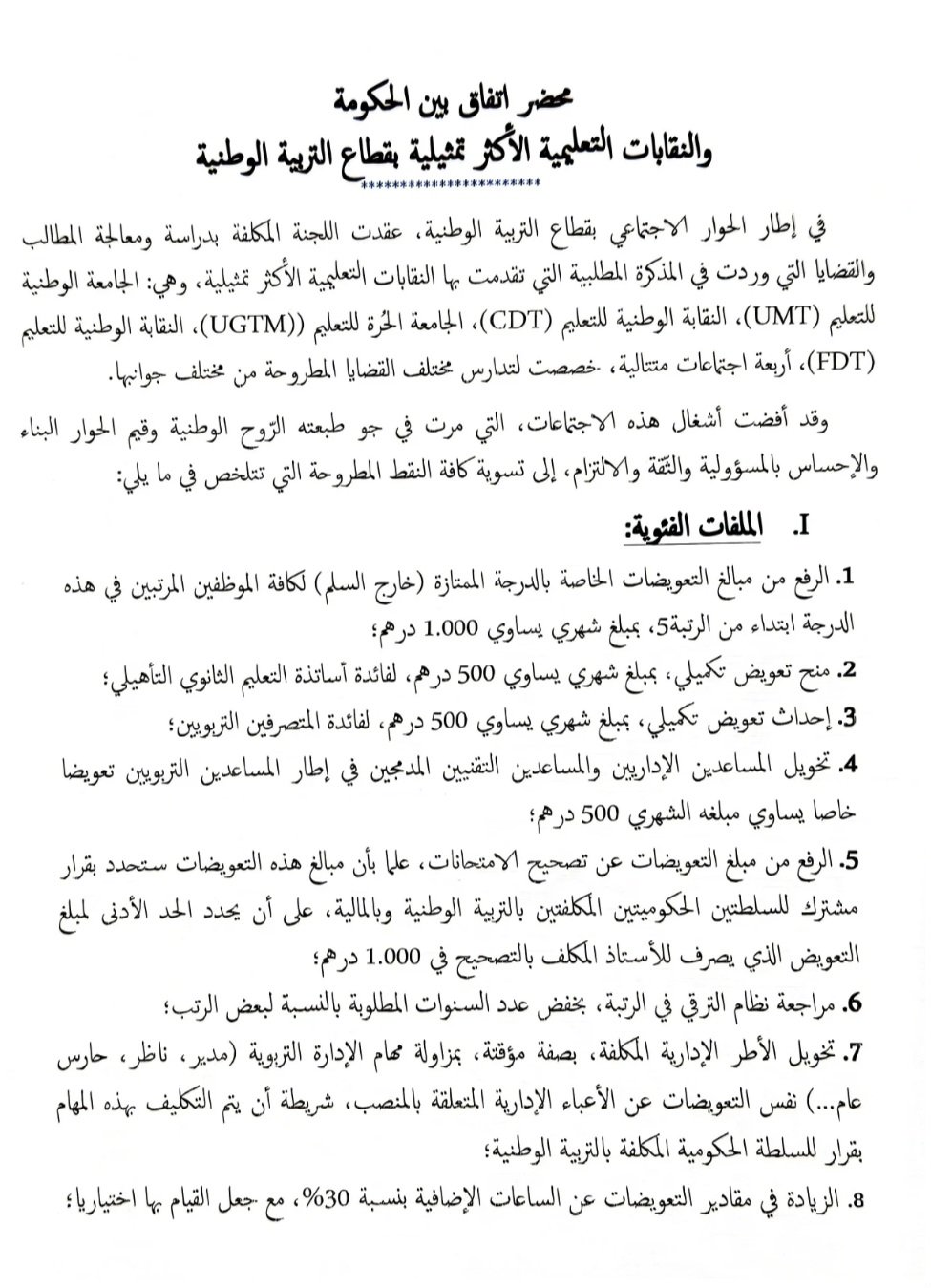 اتفق عزيز أخنوش، رئيس الحكومة مع النقابات التعليمية الأربع الأكثر تمثيلية، على زيادة قيمتها 1500 درهما في أجور الأساتذة، تصرف على قسطين متساويين (فاتح يناير 2024 وفاتح يناير 2025)، بعد سلسلة من الاجتماعات.