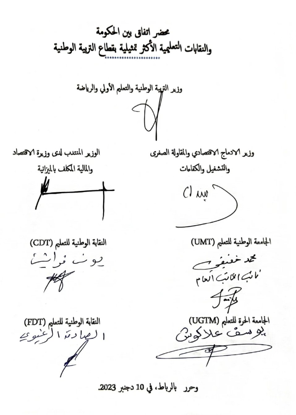 ووقع على الاتفاق إلى جانب رئيس الحكومة، كل من شكيب بنموسى، وزير التربية الوطنية والتعليم الأولي والرياضة، وفوزي لقجع، الوزير المنتدب المكلف بالميزانية، إضافة إلى يونس السكوري، وزير الإدماج الاقتصادي والمقاولة الصغرى والشغل والكفاءات.