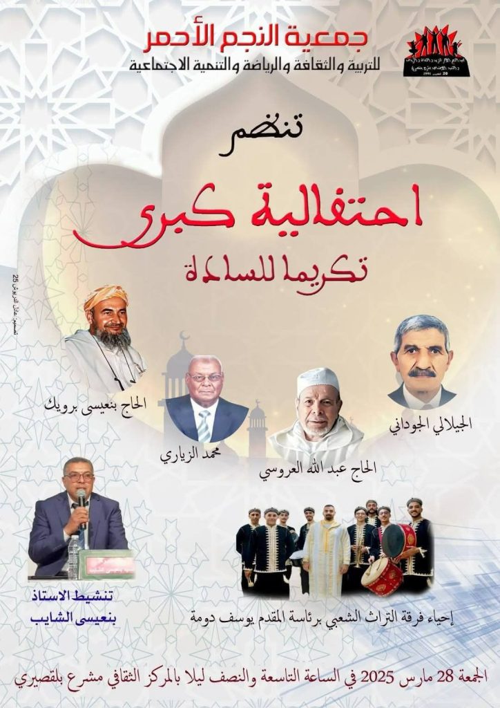 الجمعة 28 مارس 2025، بالمركز الثقافي بمشرع بلقصيري . وفي إطار ترسيخ ثقافة الاعتراف، نظمت جمعية النجم الأحمر للتربية والثقافة والرياضة والتنمية الاجتماعية احتفالية كبرى في أمسية رمضانية. تم تكريم عدد من الشخصيات المميزة، وهم: