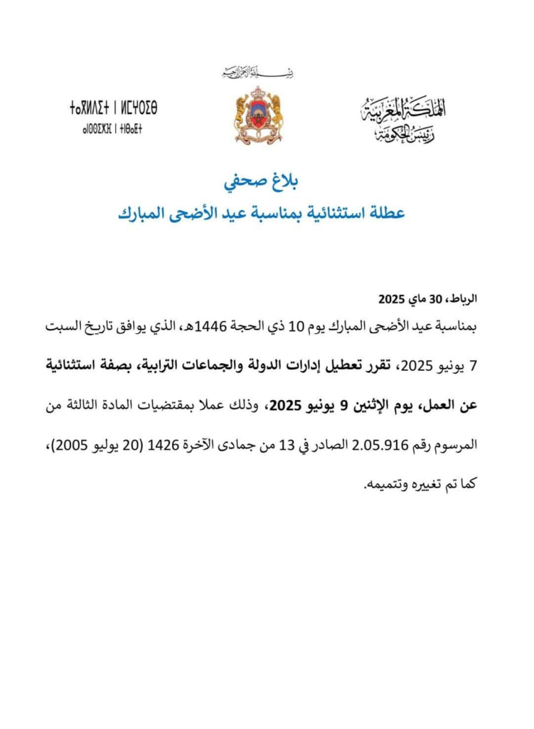 أعلنت رئاسة الحكومة عن قرار يقضي بمنح عطلة استثنائية يوم الإثنين 9 يونيو 2025، وذلك بمناسبة عيد الأضحى المبارك الذي يصادف يوم السبت 7 يونيو 2025، الموافق لـ10 ذي الحجة 1446 هـ.